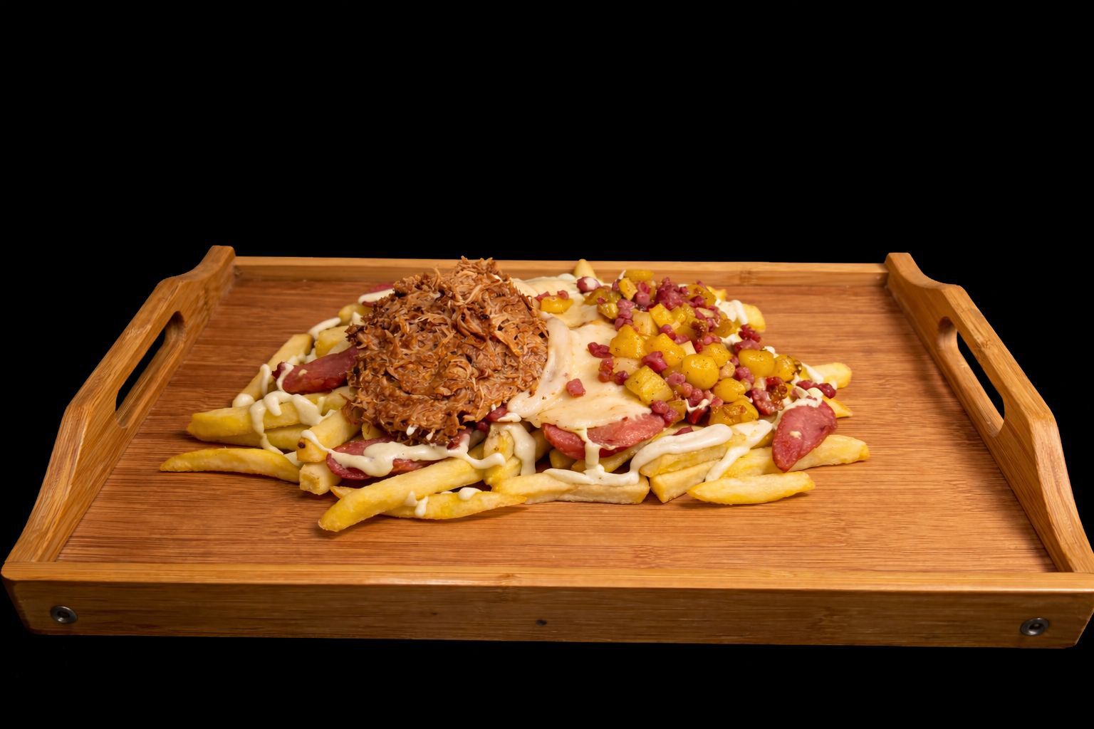 350g de Patatas, 150g de Pulled Pork, Salchicha, Piña Caramelizada, Queso Mozzarella, Bacon, Mayonesa y Ketchup.
