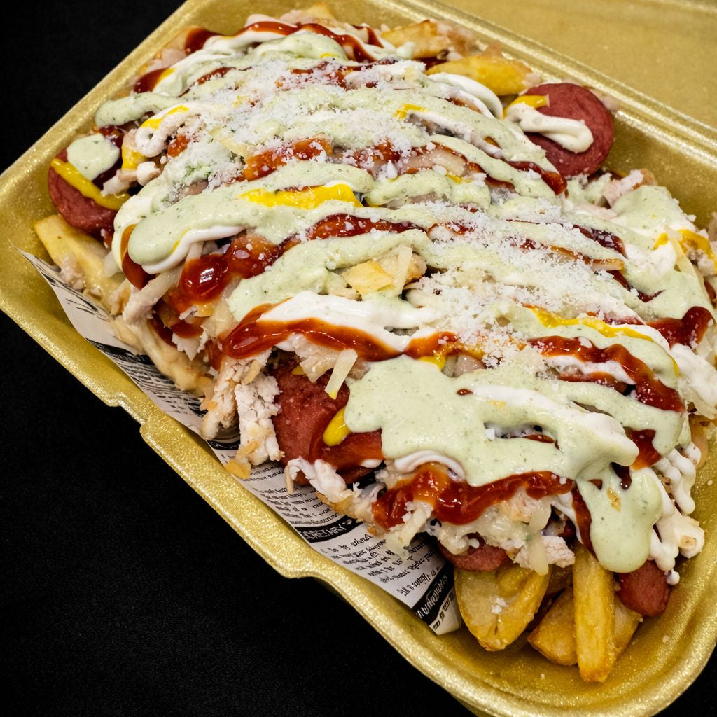 350g de Patatas, Salchicha, Pollo Mechado, Queso Mozzarella, Queso en Polvo, Mayonesa, Kétchup, Mostaza y Tártara.