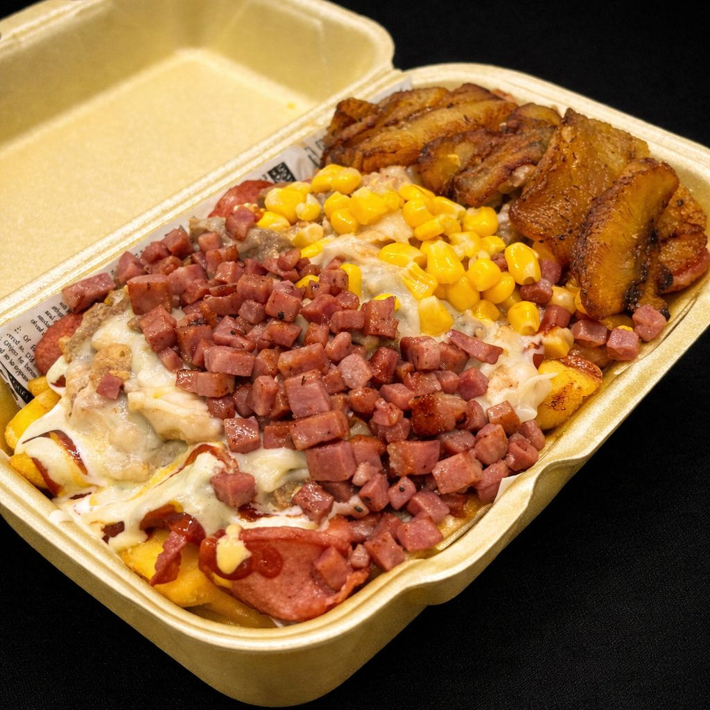 350g de Patatas, 100g de Pechuga, 100g de Carne de Bisteck, Queso Mozzarella, Maiz, Tajadas, Bacon, Salchicha, Mayonesa, Ketchup, Mostaza, Tartara y Aji Pollero.