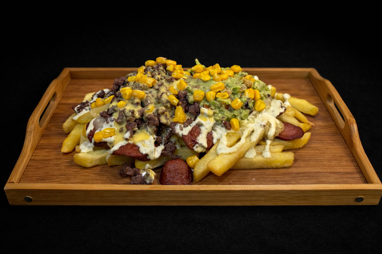 350g de Patatas, 150g de Carne Picada, Guacamole, Mayo de Jalapeño, Cheddar, Mozzarella, Salchicha y Maíz.